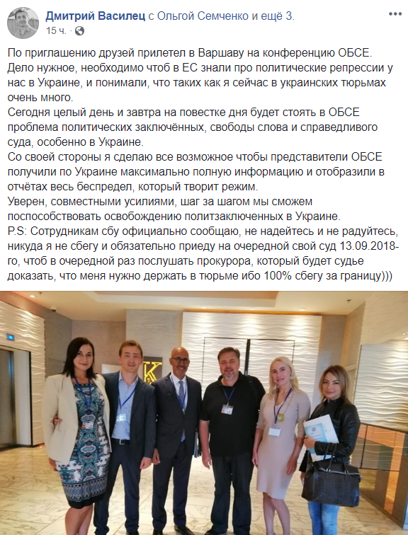 "Сотрудникам СБУ официально сообщаю, не надейтесь и не радуйтесь, никуда я не сбегу и обязательно приеду на очередной свой суд 13.09.2018-го, чтоб в очередной раз послушать прокурора, который будет судье доказать, что меня нужно держать в тюрьме ибо 100% сбегу за границу", - написал Василец у себя в Facebook.