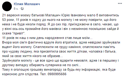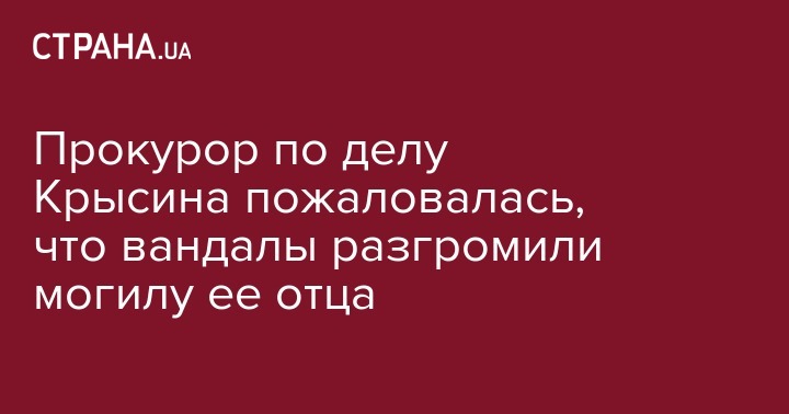 Неизвестные злоумышленники разрушили могилу отца прокурора ГПУ Юлии Малашич, которая выступает обвинителем по делу руководителя "титушек" Юрия Крысина. Об этом она написала на своей странице в Facebook.