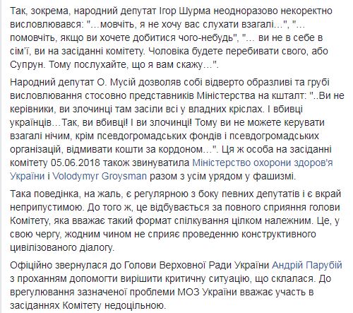 "Народный депутат А. Мусий позволял себе откровенно оскорбительные и грубые высказывания в отношении представителей Министерства вроде: "..Вы не руководители, вы преступники там засели все в креслах. И убийцы украинцев...Да, вы убийцы! И вы преступники! Поэтому вы не можете управлять вообще ничем, кроме псевдообщественные фондов и псевдообщественные организаций, отмывать средства за границей...". Это же лицо на заседании комитета 05.06.2018 также обвинило Министерство здравоохранения Украины и Владимира Гройсмана вместе со всем правительством в фашизме", - сообщает Супрун.