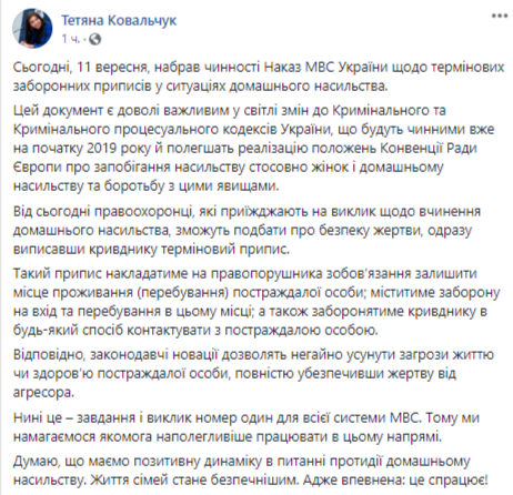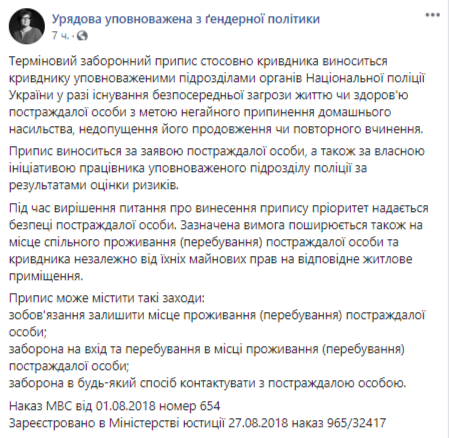 "С сегодняшнего дня правоохранители, которые приезжают на вызов совершения домашнего насилия, смогут позаботиться о безопасности жертвы, сразу выписав обидчику срочное предписание. Такое предписание накладывает на правонарушителя обязательства покинуть место жительства (пребывания) пострадавшего лица; содержать запрет на вход и пребывание в этом месте; а также запрещает обидчику любым способом контактировать с пострадавшим лицом", -написала Ковальчук.
