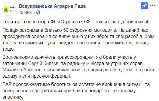По сообщению Всеукраинской аграрной рады (ВАР), внутри здания оказался заблокированным и сам владелец элеватора. Его сына Дениса Строгого не территорию не пропускали.