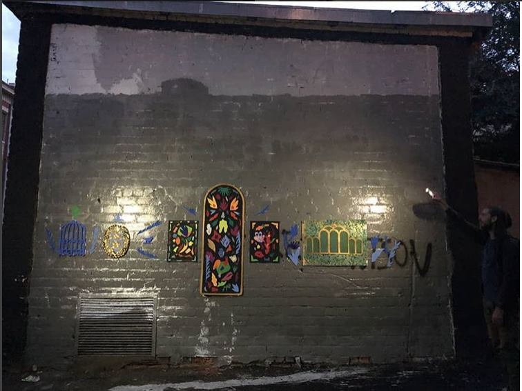 Затем на стене заняла место инсталляция из кусочков разноцветного картона. Две девушки, создавшие витраж рассказали, что они не поклонницы художника Гамлета, но его рисунок - это лучше, чем надписи и изображения, которые появились после.