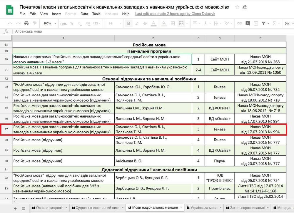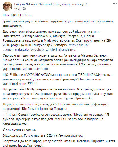 "Шок. Что. Это. Такое. Гриневич вернула в школы учебник с двуглавым орлом и российским триколором. Два года назад, со скандалом, нам удалось этот учебник снять... Сегодня эти учебники снова в школах. Активистка Марина Зеленюк "накопала" на сайте министерства образования рекомендацию использовать этот учебник снова на уроках русского языка в 1-3 классах для школ с украинским языком обучения", - пишет Лариса Ницой и высказывает возмушение тем, что украинские дети должны изучать "мокшанську мову", российский флаг и триколор..