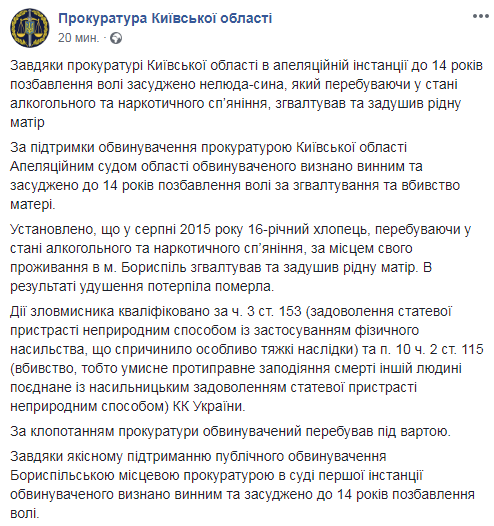 Установлено, что в августе 2015 тогда еще 16-летний подросток, находясь в состоянии алкогольного и наркотического опьянения, по месту своего жительства в городе Борисполе Киевской области изнасиловал и задушил мать. В результате удушения потерпевшая скончалась.