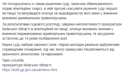 По результатам судебного рассмотрения, благодаря настойчивости прокуратуры Киевской области в апелляционной инстанции, он признан виновным в совершении инкриминируемых уголовных преступлений и повторно приговорен к 14 годам лишения свободы.