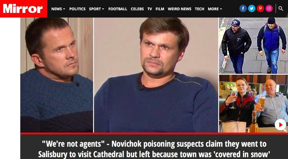 Во всех британских СМИ интервью Боширова и Петрова стало темой номер один. Они пересказывают интервью, выносят в заголовок, что россияне посещали Солсбери в туристических целях.
