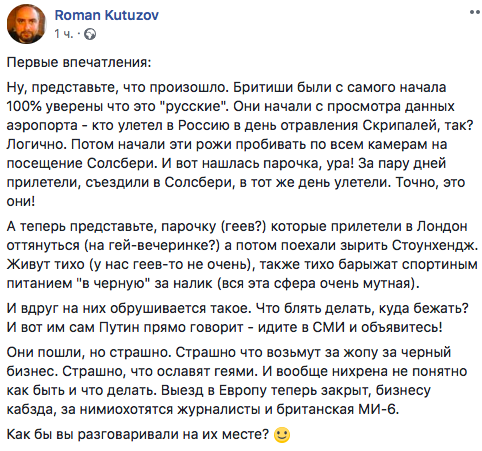 Ну, представьте, что произошло. Бритиши были с самого начала 100% уверены, что это "русские". Они начали с просмотра данных аэропорта – кто улетел в Россию в день отравления Скрипалей, так? Логично. Потом начали эти рожи пробивать по всем камерам на посещение Солсбери. И вот нашлась парочка, ура! За пару дней прилетели, съездили в Солсбери, в тот же день улетели. Точно, это они!