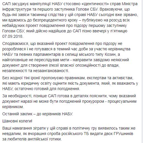 Также в САП предложили юристам, экспертам и активистам оценить качество документа, который, "как считают в НАБУ", окончательно готов для согласования. "Последний призыв - к руководителям НАБУ. Уважаемые коллеги! Ваши попытки сыграть в этом деле в политическую игру оказались такими же неудачными, как попытка российского ТВ выдать двух ГРУшников за любителей английской готики. К сожалению, репутация национальной антикоррупционной инфраструктуры в целом и конкретное, некогда вполне перспективное уголовное производство в частности, в очередной раз стали жертвами вашего инфантилизма", - резюмировали в САП.