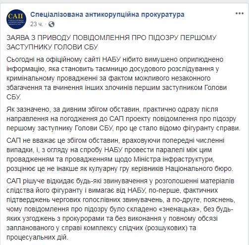 "Сегодня на официальном сайте НАБУ якобы вынужденно обнародована информация, которая составляет тайну досудебного расследования в уголовном производстве по факту возможного незаконного обогащения и совершения других преступлений первым заместителем главы СБУ. Как указано, по странному стечению обстоятельств, практически сразу после направления на согласование в САП проекта уведомления о подозрении первому заместителю главы СБУ, об этом стало известно фигуранту дела", - заявили в САП.