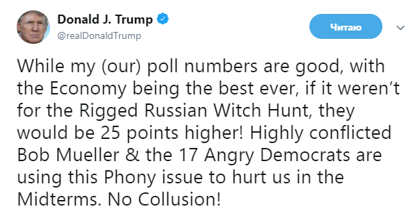 Также Трамп подчеркнул, что расследующий дело о российском вмешательстве спецпрокурор Роберт Мюллер и "17 злобных демократов" пытаются использовать его дело для того, что бы навредить республиканцам на промежуточных выборах.