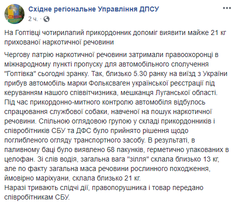 Пограничники сообщили, что житель Луганской области на автомобиле "Volkswagen" перевозил через международный пункт пропуска Гоптовка около 21 кг марихуаны.