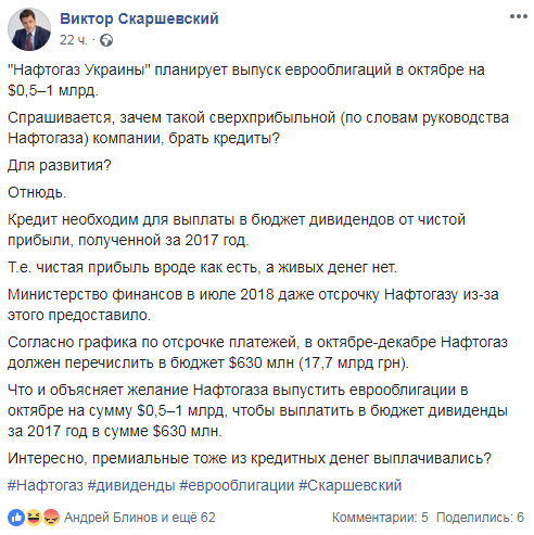 Что и объясняет желание Нафтогаза выпустить еврооблигации в октябре на сумму $0,5–1 млрд, чтобы выплатить в бюджет дивиденды за 2017 год в сумме $630 млн", - отметил он.