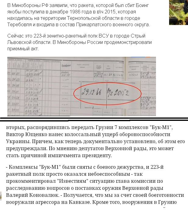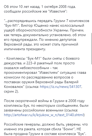 По данным юриста, зенитные комплексы "Бук" из 223 полка, которые базировались в Стрыю, о чем писала "Страна"... были проданы Грузии! Их продал Ющенко еще в 2007 году.Об этом 10 лет назад, 1 октября 2008 года, сообщали российские же "Известия": "...распорядившись передать Грузии 7 комплексов "Бук-М1", Виктор Ющенко нанес колоссальный ущерб обороноспособности Украины. Причем, как теперь документально установлено, об этом его предупреждали. По мнению депутатов Верховной рады, это может стать причиной импичмента президенту. Комплексы "Бук-М1" были сняты с боевого дежурства, и 223-й ракетный полк просто оказался небоеспособным - так прокомментировал "Известиям" ситуацию глава комиссии по расследованию вопросов о поставках оружия Верховной рады Валерий Коновалюк", - цитирует он сообщение СМИ