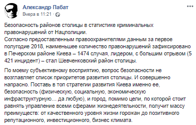 Шевченковский район Киева назван самым криминогенным среди всех 10 районов столицы. Такие данные обнародовал на своей странице в соцсети депутат Киевсовета Александр Пабат, сославшись на ответ Главного управления Национальной полиции в г. Киеве.