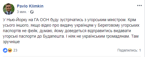 Он отметил, что встреча с венгерским министром произойдет в Нью-Йорке на Генеральной ассамблее ООН. Там он и собирается обсудить с ним видео про выдачу украинцам в Берегово венгерских паспортов, если оно не фейк.