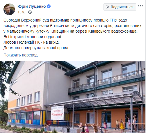 Частный лагерь ООО "Детский оздоровительный лагерь санаторного типа Славутич" в Киевской области, где в июле случилось массовое отравление детей, 19 сентября решением Верховного суда вернули в государственную собственность. Об этом написал генпрокурор Украины Юрий Луценко на своей странице в Facebook.