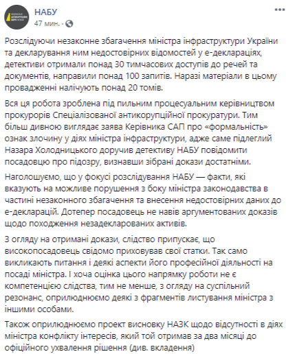 "Расследуя незаконное обогащение министра инфраструктуры Украины и декларирования ним недостоверных сведений в электронной декларациях, детективы получили более 30 временных доступов к вещам и документам, направили более 100 запросов. Сейчас материалы в этом производстве насчитывают более 20 томов", - сказано в сообщении НАБУ на странице в соцсети Facebook в среду.