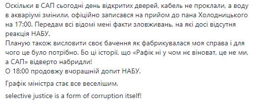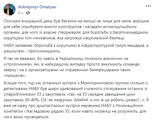 Ранее в этот день министр инфраструктуры Омелян сообщил на своей странице в Facebook, что намерен передать руководителю САП (САП) Назару Холодницкому информацию о злоупотреблениях в инфраструктурной сфере, на которые не отреагировало НАБУ.
