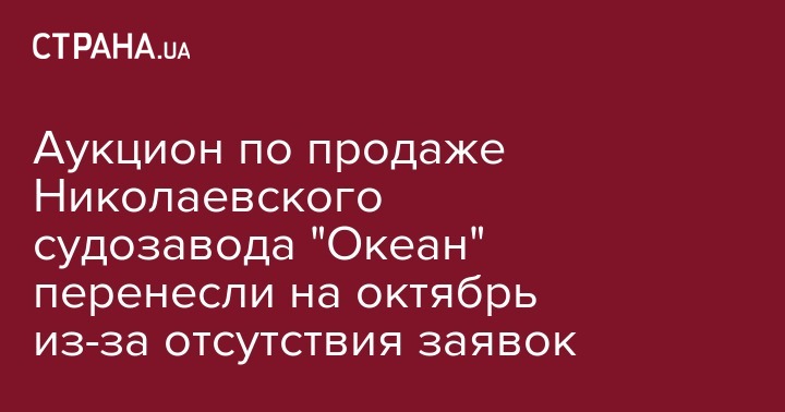 Намеченный на 21 сентября открытый аукцион по продаже целостного имущественного комплекса (ЦИК) ПАО "Николаевский судостроительный завод "Океан" по стартовой цене 1,8 млрд грн в соответствии с законом "О восстановлении платежеспособности должника или признании его банкротом" перенесен на октябрь в связи с отсутствием поданных заявок, сообщает Интерфакс-Украина со ссылкой на ликвидатора Ирину Сербину.