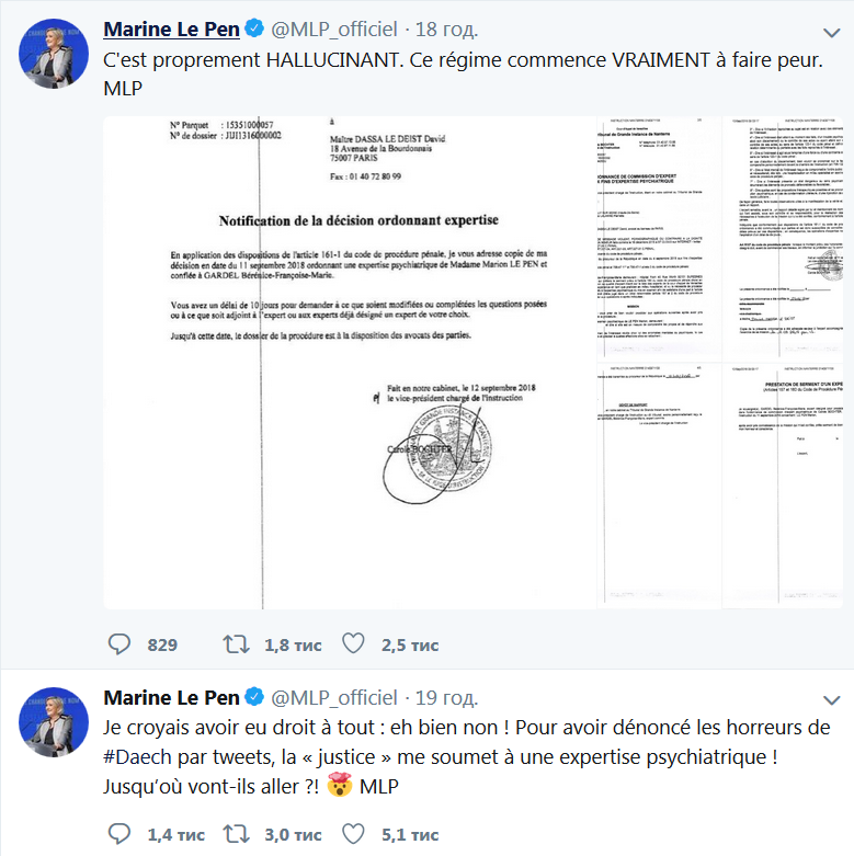 Копию постановления суда от 12 сентября Ле Пен выложила в Twitter. Согласно документу, суд хочет, чтобы экспертиза установила, страдает ли политик каким-либо психическим заболеванием и, если да, то могло ли оно повлиять на осознание ею своих действий в то время, когда она публиковала страшные фото.