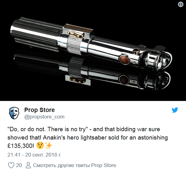 "Делай или не делай. Не стоит пытаться - и эти торги определенно показали это! Лазерный меч героя Энакина Скайуокера продан за удивительные £135 тысяч!", - написали торговцы.