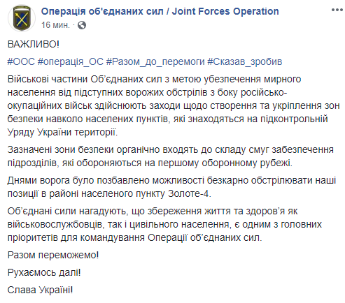 "Указанные зоны безопасности органично входят в состав полос обеспечения подразделений, обороняющихся на первом оборонительном рубеже. На днях врага был лишен возможности безнаказанно обстреливать наши позиции в районе населенного пункта Золотое-4", - сказано в сообщении.