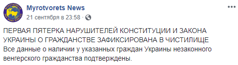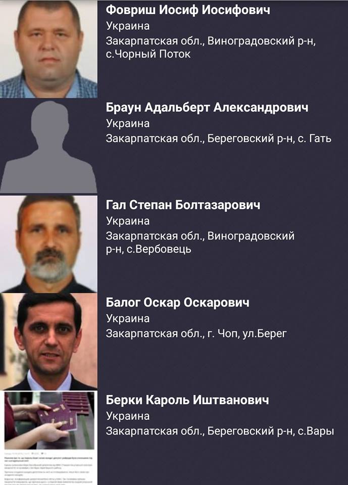 Сообщается, что они являются владельцами венгерских паспортов из Закарпатья. "Первая пятерка нарушителей Конституции и Закона Украины о гражданстве зафиксирована в "Чистилище". Все данные о наличии в указанных граждан Украины незаконного венгерского гражданства подтверждены", - говорится в сообщении.