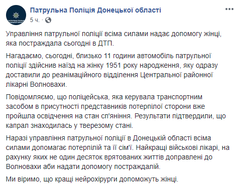 Сообщается, что полиция совершила наезд во время патрулирования одной из улиц в Волновахе. В результате наезда 56-летняя женщина получила телесные повреждения, ее госпитализировали в реанимационное отделение Центральной районной больницы города.