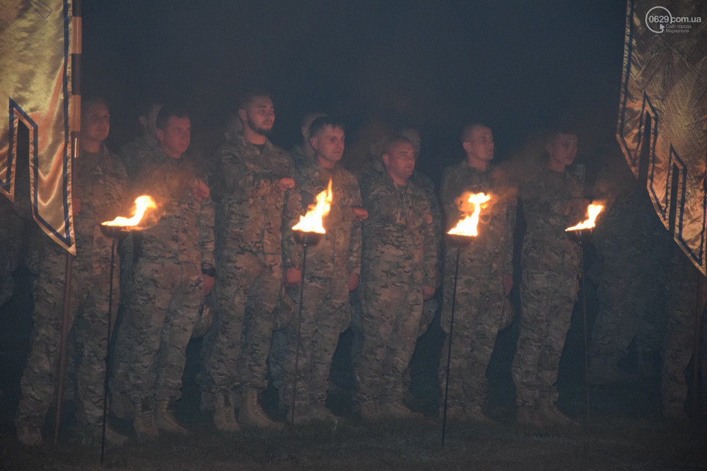 Была разыграна настоящая мистерия. Все подразделения полка выстроились на поле под своими штандартами, затем при свет факелов прошла молитва украинского националиста. Под эпическую музыку вышла щитоносная группа. На каждом из 35 щитов был написан позывной погибшего добровольца. Особенность церемонии в этом году состояла в том, что вспоминали не только погибших в боях азовцев, но и тех, кто служил в полку ранее, а после перешел в другие батальоны и был убит на Донбассе. Вспоминали и азовцев, погибших в результате несчастных случаев.