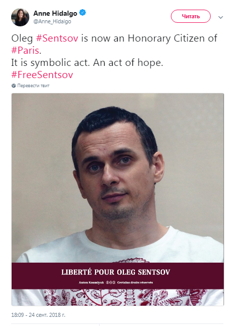 Отметим, что Парижский совет единогласно проголосовал за присуждение звания почетного гражданина Парижа Олегу Сенцову.