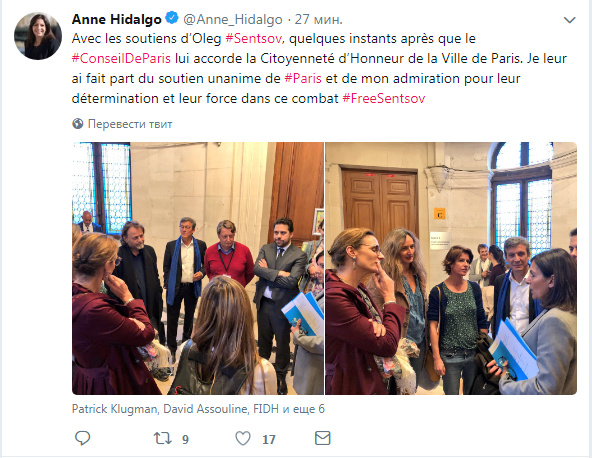 Также Анн Идальго разместила фотографии, на которых она запечатлена со сторонниками Олега Сенцова через несколько минут после голосования. Она выразила им поддержку.