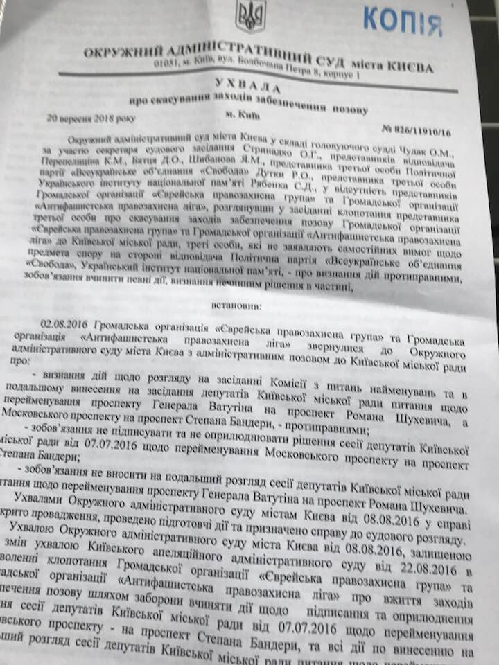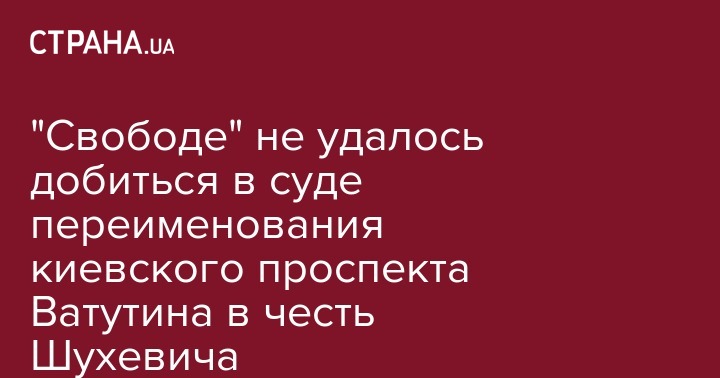 Ранее, еще 1 июня 2017 года, Киевский городской совет принял решение о переименовании проспекта генерала Ватутина в проспект имени Шухевича. Однако после этого решением суда переименование было отменено. И именно данное постановление попыталась оспорить "Свобода".