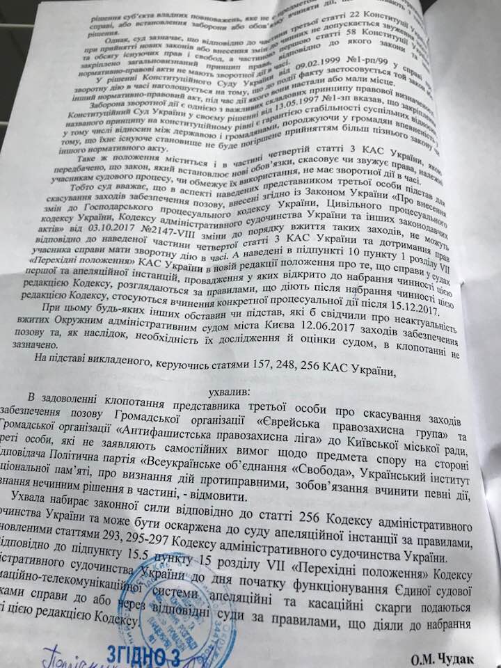 По ее словам, "ВО Свобода" пыталась добиться отмены мер по обеспечению иска по делу о переименовании проспекта имени Николая Ватутина в проспект Шухевича.