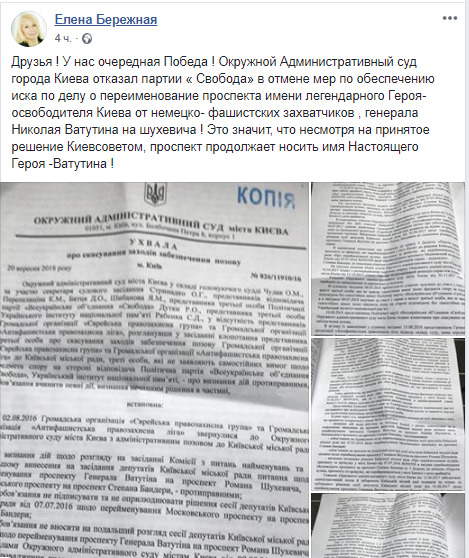 Окружной Административный суд Киева отказал партии "Свобода" в отмене запрета на переименование проспекта Ватутина в честь Шухевича. Об этом на своей странице в Facebook написала директор Института правовой политики и социальной защиты Елена Бережная на своей странице в Facebook.