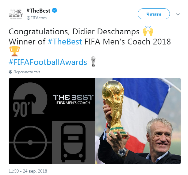The Best FIFA Football Awards. Лучшим тренером признан Дидье Дешам