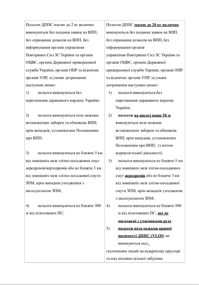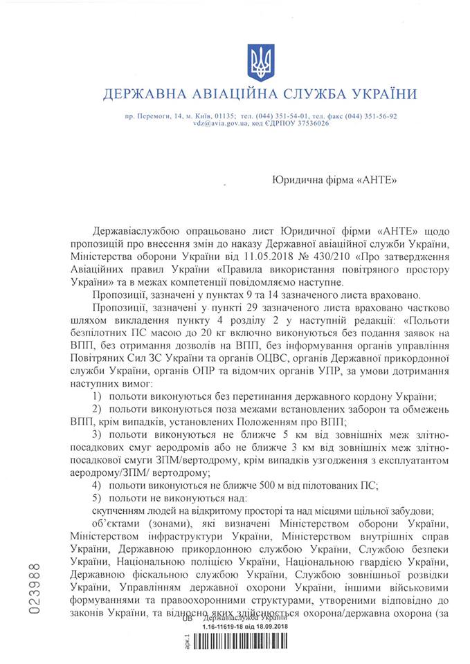 В ответе на запрос юристов фирмы "Анте", который обнародовал на своей странице в Facebook Андрей Гук отмечается, что основные изменения в правилах использования БПЛА в воздушном пространстве Украины коснулись максимального веса дрона, предназначенного для свободного пилотирования: предельный вес установлена в пределах "до 20 кг "(в предыдущей версии правил - до 2 кг).