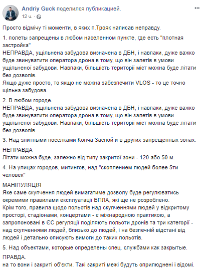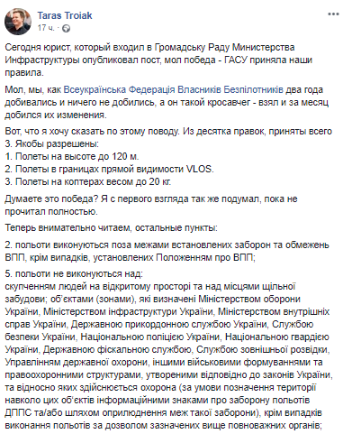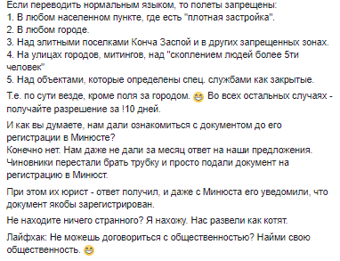 "Если переводить на нормальный язык, то полеты запрещены: в любом населенном пункте, где стоит более пяти человек на улице. В любом городе. Над элитными поселками, Конча-Заспе и в других запрещенных зонах. На митингах и во время массовых мероприятий. Над объектами, которые определены спецслужбами как закрыты. То есть, по сути, везде, кроме поля за городом ", - написал он.