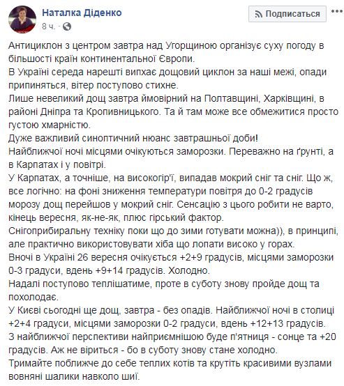 По ее прогнозам, ночью в Украине 26 сентября ожидается +2+9 градусов, местами заморозки 0-3 градуса, днем +9+14 градусов. Лишь небольшой дождь завтра вероятен в Полтавской, Харьковской областях, в районе Днепра и Кропивницкого.