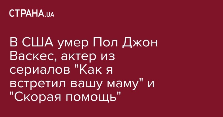 В США был найден мертвым 48-летний актер Пол Джон Васкес, известный по американскому ситкому "Как я встретил вашу маму". В бессознательном состоянии дома в Сан-Хосе его нашел отец. Прибывшие на вызов медики не сумели спасти актера.