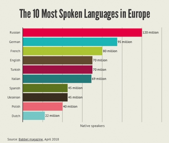 Русский, немецкий и французский - наиболее широко употребляемые языки среди населения Европы. Такие данные приводит Совет Европы в Facebook по случаю Европейского дня языков, который отмечают 26 сентября. Украинский же занял почетное 8 место.