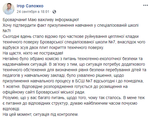 Мэр Броваров Игорь Сапожко сообщил, что школа не будет работать до понедельника 1 октября. Об этом он написал на своей странице в Facebook. "Понимаю, что у вас много вопросов относительно того, почему так произошло. У меня тоже есть вопросы в соответствующие структуры, думаю, в ближайшее время услышим ответы. На данный момент, ситуация под контролем", - написал он.