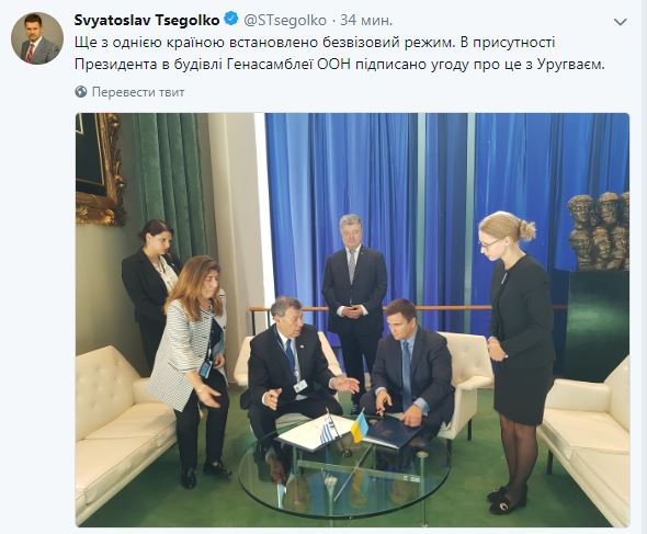 "Еще с одной страной установлен безвизовый режим. В присутствии президента в здании Генассамблеи ООН подписано соглашение об этом с Уругваем", - написал Цеголко.