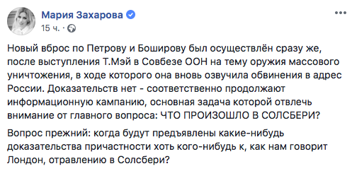 "Новый вброс по Петрову и Боширову был осуществлен сразу же, после выступления Т.Мэй в Совбезе ООН на тему оружия массового уничтожения, в ходе которого она вновь озвучила обвинения в адрес России. Доказательств нет - соответственно продолжают информационную кампанию, основная задача которой отвлечь внимание от главного вопроса: ЧТО ПРОИЗОШЛО В СОЛСБЕРИ? Вопрос прежний: когда будут предъявлены какие-нибудь доказательства причастности хоть кого-нибудь к, как нам говорит Лондон, отравлению в Солсбери?".