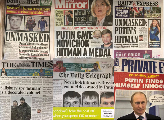 "Страна" сделала коллаж из передовиц британских СМИ за 27 сентября - все они с выносом о третьем расследовании The Insider и Bellingcat.