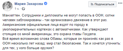 "Манхеттен. Сотрудники и дипломаты не могут попасть в ООН, сотни человек заблокированы - так организовано движение в этот раз. Американские официальные лица ездят по городу в умопомрачительных кортежах с автоматчиками. Как утверждают стоящие со мной американцы, это охрана главы Госдепа. Всё время вспоминаю слова Обамы, которые он произнёс как раз в ООН несколько лет назад: мир стал безопаснее. Так и хочется уточнить: для тех, у кого больше оружия?" - пишет в соцсети Захарова.
