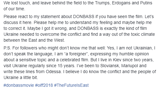 Режиссер добавил, что он не украинец, не говорит на украинском, и что его отзыв - отзыв иностранца, выражающего свое мнение.