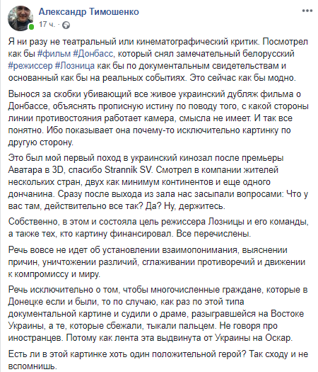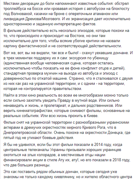 "Я ни разу не театральный или кинематографический критик. Посмотрел как бы #фильм #Донбасс, который снял замечательный белорусский #режиссер #Лозница как бы по документальным свидетельствам и основанный как бы на реальных событиях. Это сейчас как бы модно.