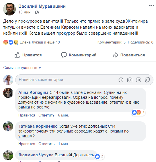 По словам Муравицкого, прямо в зале суда Житомира титушки вместе с главой националистов из С14 Евгением Карасем напали на адвокатов и избили их. "Когда вышел прокурор было совершено нападение", - сообщил Муравицкий.