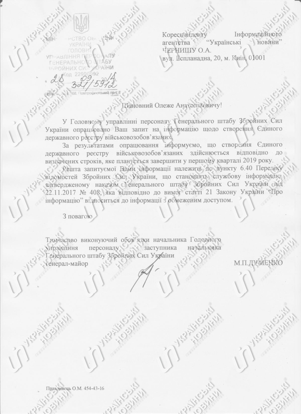 Министерство обороны планирует завершить создание Единого государственного реестра военнообязанных до апреля 2019 года. Однако информация о финансировании проекта засекречена. Об этом сообщают "Украинские новости".