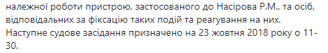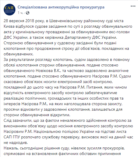 В САП подчеркнули, что ранее по факту ненадлежащего осуществления контроля за выполнением обязательства по ношению электронного средства контроля Насировым со стороны Национальной полиции Украины на основании письма САП Генеральная прокуратура Украины начала служебную проверку, заключение по которой пока не поступило.